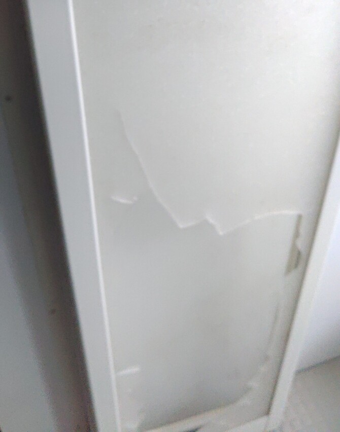 内側のガラスだけ割れてしまっています、外側のガラスは割れていないので雨風の侵入は防ぐことができますが断熱効果は空気の層が無くなるので断熱機能はていかしますね、割れた状態のままでは危険ですし、ペアガラスは納期に時間がかかるので早めにご対応したほうがいいですね。 - ペアガラスは2枚のガラスの間に空気の層があるガラスです、2枚あるうちのどちらかが割れてしまったら2枚とも交換になります、1枚だけの交換はできません。