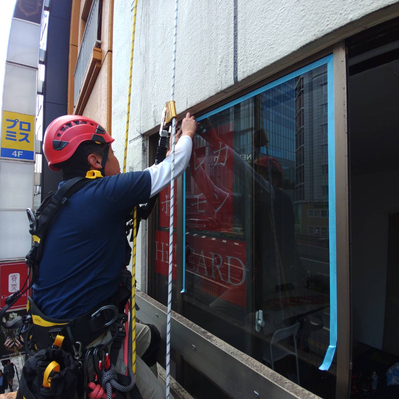 専用のロープとハーネスを使用して作業員が建物の外壁面に降下し、直接ガラス部分にアクセスできるため、
