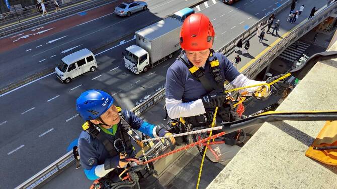 しかしロープアクセスでは、訓練を受けた作業員が専用ロープを使用して作業箇所に直接降下し、短時間で修理を行うことが可能です。