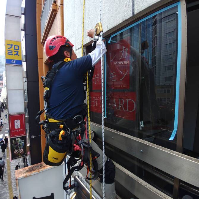 ロープアクセスにて高所窓ガラスを交換。